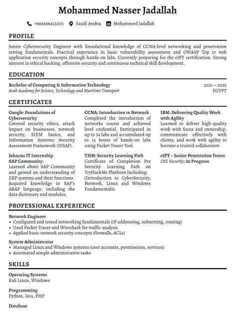 ابحث عن فرصة عمل مناسبة، حيث انني حاصل على بكالوريوس الحاسبات وتكنولوجيا المعلومات. لدي خبرة في الشبكات وأمن المعلومات واختبار الثغرات، مع العمل على أنظمة Linux وWindows. كما لدي خبرة في تحليل الشبكات باستخدام أدوات مثل Wireshark وPacket Tracer، ومعرفة بلغات البرمجة وقواعد البيانات