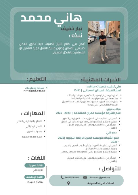 أنا فني كهربائي خبرة في الدوائر الكهربائية تحكم وبورد وقراءة الدوائر الكهربائية وشرحها والصيانة عملت في عدة مصانع بقسم الصيانة عملت أيضا كمدرب وأستاذ بمركز التدريب المهني والتلمذة الصناعية ورئيس قسم الكهرباء العامة حاصل علي شهادة مدرب مهني أولية وحديثة المؤهل العلمي دبلوم كهرباء