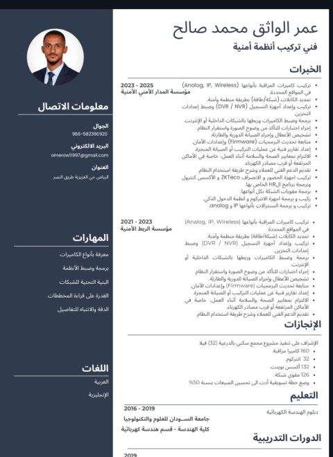 فني حاسوب وكاميرات مراقبة وشبكات وانتركوم ومقويات شبكة أقفال الكترونية خبرة تزيد عن 5 سنوات في صيانة أنظمة الحاسوب بارع في تشخيص المشاكل الفنية وحلها بسرعة وكفاءة امتلك مهارات ممتازة في العمل مع أنظمة التشغيل المختلفة وتقديم الدعم الفني للعملاء على دراية واسعة بتطبيقات المايكروسوفت أوفيس بكامل برامجة