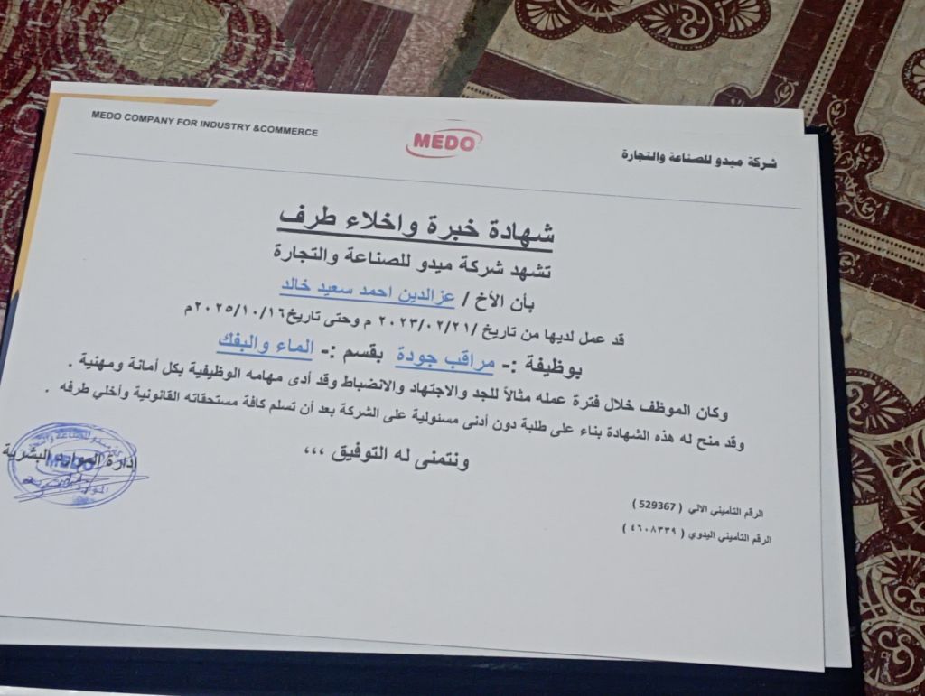 أنا خريج بكالوريوس كيمياء صناعية وعندي خبرة ثلاث سنوات بوظيفة مراقب جودة في قسم الماء وامتلك مهارات في تشغيل وحدة معالجه المياه (محطة تحلية المياه)