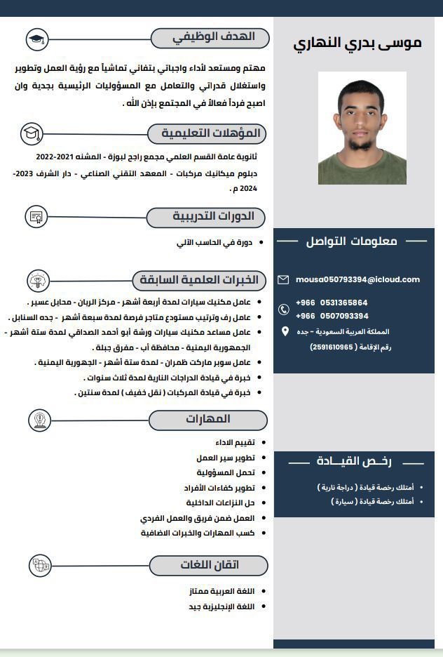 مساعد ميكانيك سيارات بجداره خبرة سنة كاملة دراسة دبلوم سنتين ميكانيك مركبات خفيفه أتمنى العمل لدى شركة رائدة في مجال الميكانيك (جدة)