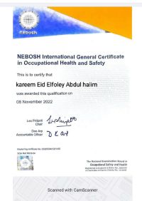 I hold internationally accredited certifications in occupational safety and health, including the NEBOSH International Certificate in Occupational Safety and Health, a certificate from the Sadat Academy for Administrative Sciences, a diploma in first aid and firefighting, and a diploma in rotating equipment from the Engineers Academy. My areas of expertise include site and project safety, factory