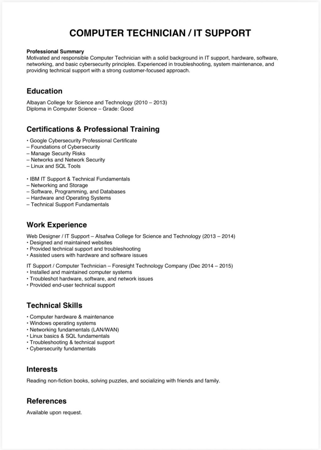 أنا شاب حاصل على دبلوم تقنية معلومات، ابحث عن فرصة عمل في جدة في أي مجال متعلق بالحاسب مثل ادخال البيانات أو الدعم الفني أو البرمجة، لدي مهارات جيدة في استخدام الحاسب والبرامج المكتبية وأتميز بالدقة وسرعة التعلم والعمل تحت الضغط والقدرة على التعامل مع مختلف المهام التقنية، كما امتلك مستوى جيد في اللغة الانجليزية، متاح للعمل فورا وجاهز للعمل بدوام كامل أو بنظام الشفتات. جدة. جاهز لي شغل لي أي مجال