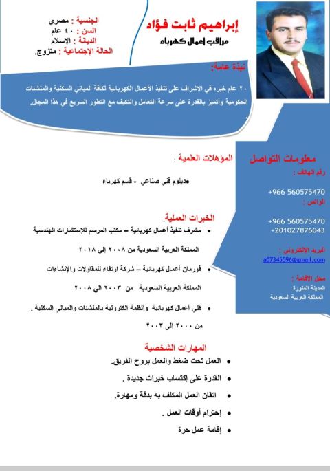 ابحث عن وظيفة مراقب كهربائي تأسيس منازل خبرة 20 سنة في هذا المجال