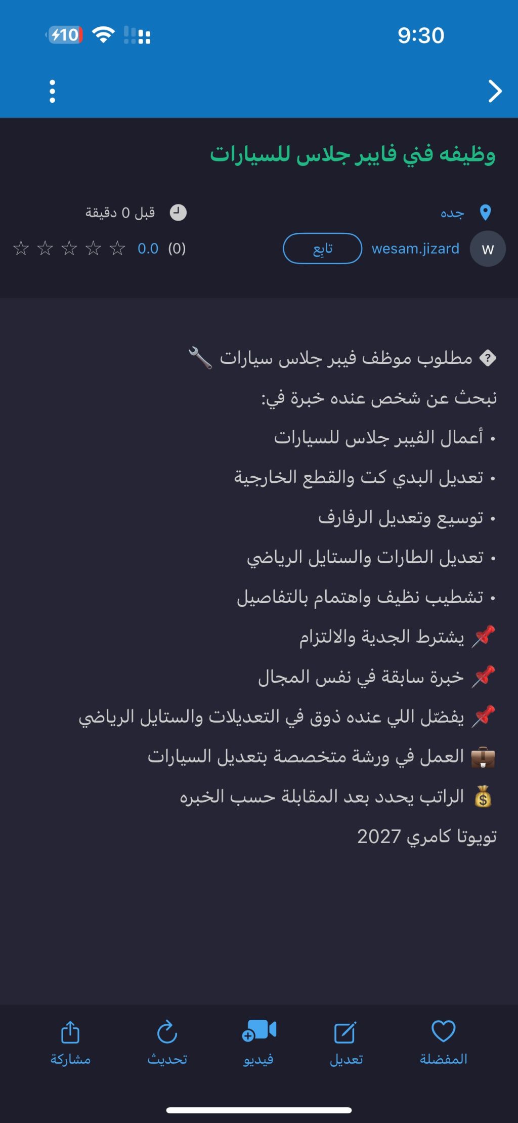 أحتاج معلم فيبر جلاس للسيارات ذو خبرة عاليا في تعديل السيارات والطارات والرفا رف الرواتب مجزيه على حسب الخبرة العمل في جدة في ورشة يوجد سكن ووجبات غدا وعشاء منطقة العمل في المملكة العربية السعودية جدة حي عسفان