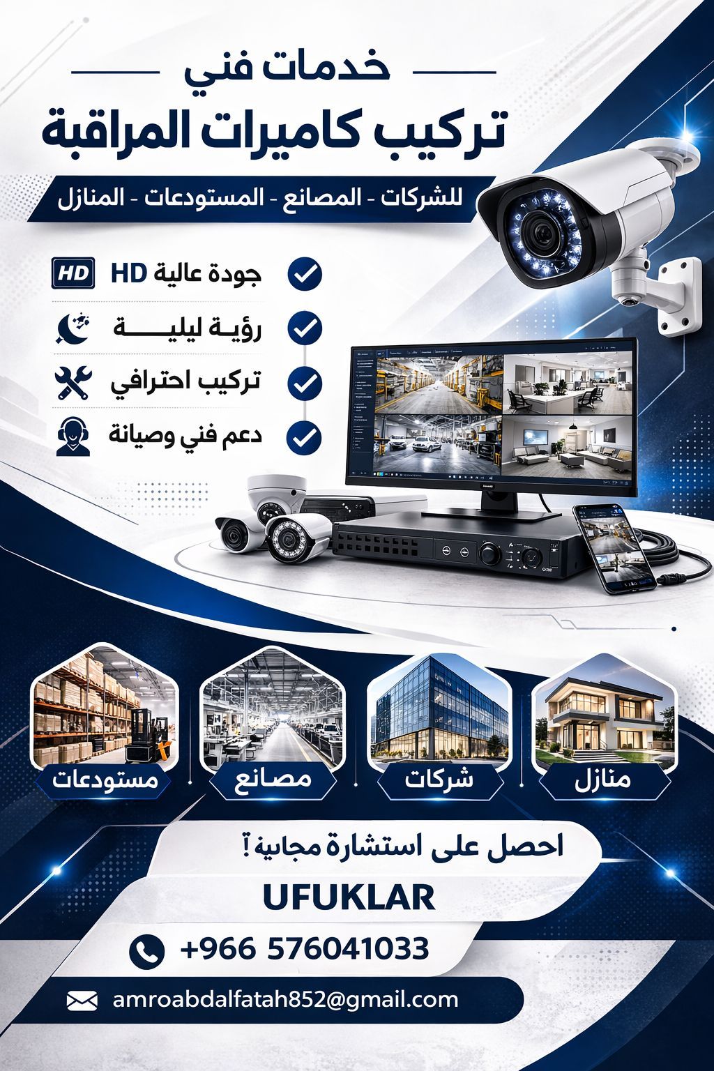 تركيب كاميرات مراقبة باحترافية للمنازل والشركات والمستودعات ربط مباشر بالجوال + ضمان على التركيب
