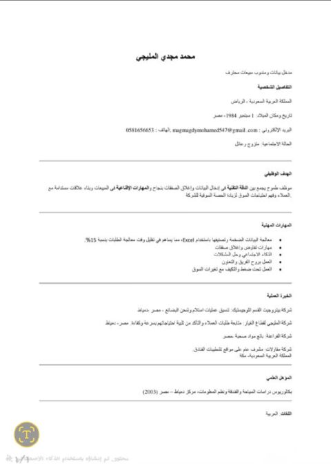 الاسم مأمون قاسم الجنسية سوري الموقع مكة، المملكة العربية السعودية (اتصال فقط) المسمى الوظيفي المستهدف كاشير / موظف مبيعات / تسويق الهدف المهني شاب سوري طموح مقيم في مكة، يبحث عن عمل ونقل كفالة امتلك خلفية تقنية وعملية متنوعة. أسعى لتوظيف مهاراتي في خدمة العملاء، المبيعات، والتعامل مع الأنظمة المحاسبية والتقنية للمساهمة في نجاح العمل وتطوير مهاراتي المهنية