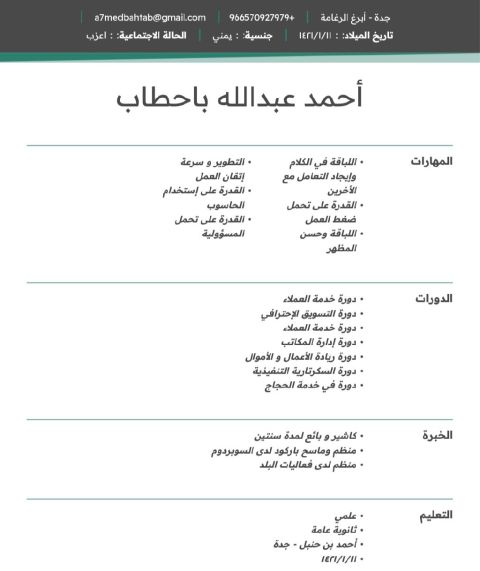 أحمد عبد الله بأحطاب يمني مواليد العمر 25 المدينة جدة الدورات علاقات عامة خدمة العملاء ريادة الأعمال والأموال السكرتيرية الننفيذية وادارة المكاتب التسويق الاحترافي إقامة سارية وقابلة للنقل اشتغلت سنتين بائع وكاشير أجيد استخدام الحاسب ابحث عن أي عمل. مستعد اشتغل أي شيء