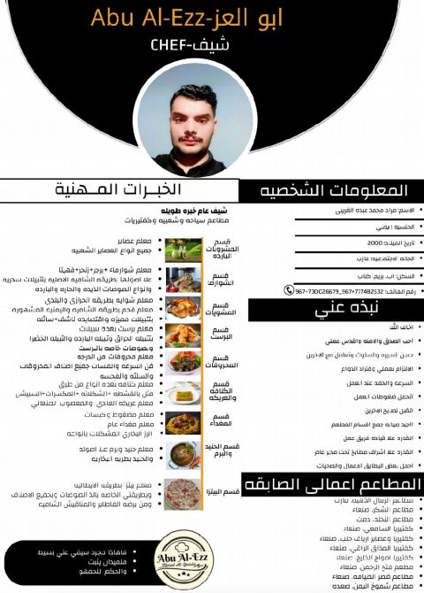 اللقب أبو امجد جنسية اليمن المهنة شيف كرت صحي ساري المفعول التحضيرات الرز الصياديه الأبيض الأحمر البرياني والزربيان الطواجن جميع طواحن في الكريمات والطماطم والصوص الأحمر والسيفودات بالكريمة والطماطم والمكرونه والايدامات والشربات ثمار البحر والطماطم الحمراء الوصوصات طحينية حمر شطه الحم باص والمتبل والتبوله والسلطات تحضير جميع الخلطات للمشوي والمقلي خبرة باستلام وادارة المطاع