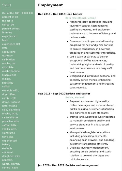 السيرة الذاتية الاسم طارق أبو زهار المهنة باريستا محترف الخبرة 6 سنوات الموقع جدة - السعودية الحالة دوام كامل - الملخص المهني باريستا متمرس بخبرة 6 سنوات في جدة، متميز في اعداد أنواع القهوة المختصة، وإدارة محطة العمل، وتقديم تجربة عملاء راقية. شغوف بالقهوة والتطوير المستمر، ودقيق في ضبط النكهات والجودة. المهارات اعداد القهوة المختصة (V60