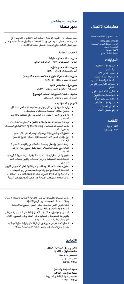 Operations Manager with over 20 years of experience in the confectionery, restaurant, and café industry in Egypt and Saudi Arabia. A graduate of the Faculty of Tourism and Hotels, Cairo University, currently residing in Al - Baha, Saudi Arabia. Valid residency permit, driver's license, and unified health certificate. Ready for sponsorship transfer with a suitable job opportunity. area or operation
