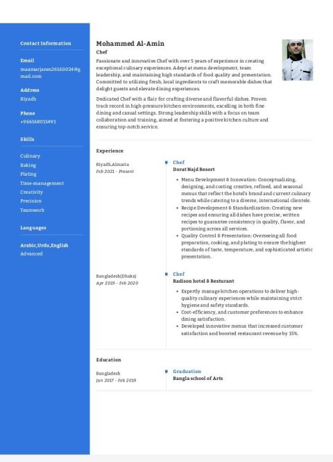 I am an Eastern pastry chef seeking employment in or outside of Al Khobar. My current location is in Al Khobar, Eastern Province. I have a valid and transferable residency permit. I possess a health certificate. I have completed a food safety training course. I am of Syrian nationality. Marital status Single. Praise be to God, I have approximately