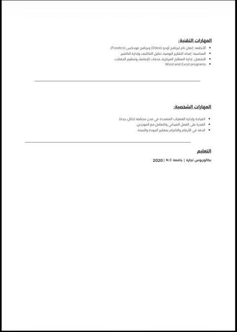 شيف عام خريج سياحة وفنادق قسم مطبخ واشتغلت إيطالي وشرقي وفاست فود ومأكولات بحرية شيف أجيد تدريب الموظفين وتعليمهم وعمل منيو بالريسبي وأشرف علي تشغيلة ومتابعه حركة الدوام وتسجيل الفواتير والهالك ومتابعه فوديكس وترتيب جداول الموظفين خبرة 12 سنة موجود في جدة الإقامة منتهية بسبب غلق فروع الشركة كنت اعمل في شركة الصيادية مأكولات بحرية شيف عمومي ونائب مدير الفرع الرئيسي أريد مطعم أو فندق أو شركة