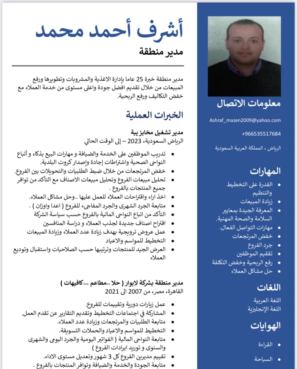 مدير تشغيل كافية ومطعم ومخبز موجود مصري في السعودية خبرة 25 في الخدمة والجودة والضيافة وتنظيم حفلات فطار وسحور في فوا دفون القرية الذكيه خريج كلية سياحة وفنادق لديه القدرة التطوير ورفع المبيعات من خلال تقديم أفضل جودة وأعلى مستوى من الخدمة العملاء مع خفض التكاليف ورفع الربحيه