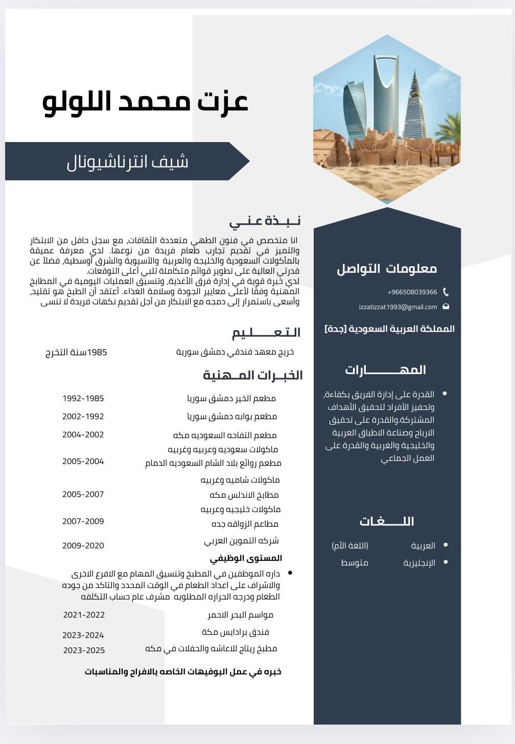 شيف سوري الجنسية يجيد جميع الاكلات العالميه والعربية والأسيوية خبرة أكثر من خسمه وعشرين سنة بمجال المطاعم كما يجيد ابتكار منيوهات من الاكلات مع حساب تكلفتها وكما يجيد ادارة المطبخ والتدريب وتأهيل العاملين ضمن المطبخ لنهوض المطعم وزيادة الانتاج والأرباح عملت أكثر من 15 سنة بمطابخ الكاترين كما عملت بمطاعم كثيره ضمن المملكة وخارجها وأجيد جميع الاكلات السعودية بما فيها الشعبية كما أجيد عمل بوفيهات أفراح