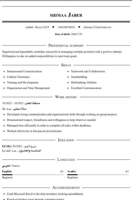 موظفة بالمجالات ذي وعندي خبرة فيهم كاشيرة - باريستا - كابتن وايتر - استقبال (اعمل بس في جنوب جدة)