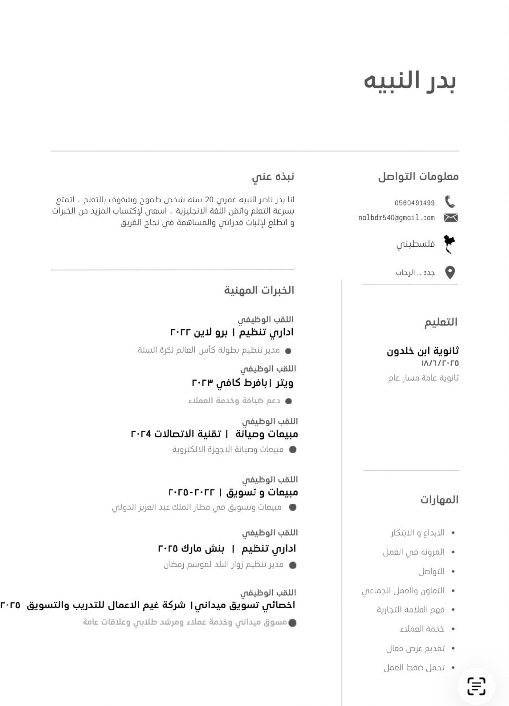 أنا بدر ناصر النبيه، عمري 20 سنة. شخص طموح، ملتزم، وأحب أتعلم وأطور من نفسي باستمرار. عندي خبرة في التنظيم، المبيعات، وخدمة العملاء، واشتغلت في كافيهات ومعارض وشركات تدريب وتسويق. أتميز بسرعة التعلم، اللباقة في التعامل، وتحمل ضغط العمل، وأحب اشتغل بروح الفريق. ابحث عن وظيفة مناسبة مثل وايتر أو مساعد باريستا بائع في معرض ثابت جاهز أكون جزء من فريق ناجح وأقدم أفضل ما عندي