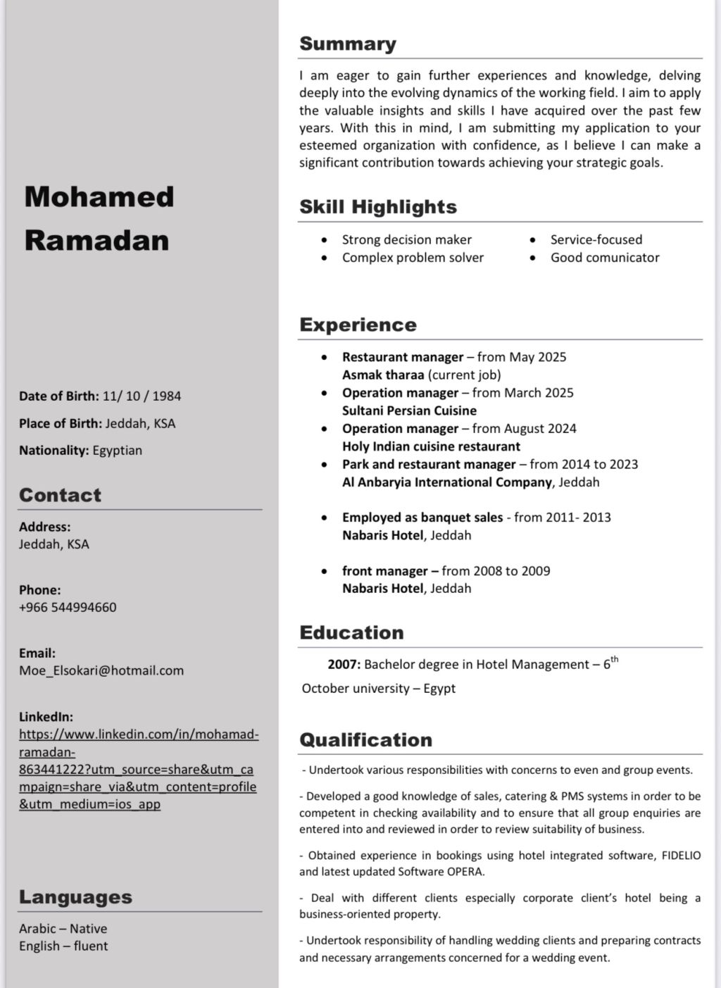 مدير عمليات مطاعم يتمتع بخبرة تتجاوز عشر سنوات في إدارة وتشغيل المطاعم والحفلات، حاصل على درجة البكالوريوس في إدارة الضيافة والفنادق. متخصص في تطوير الأداء التشغيلي، وقيادة الفرق، وتحسين جودة الخدمة لضمان تجربة ضيافة مميزة. لدي سجل ناجح في إدارة مطاعم المأكولات البحرية وتحقيق مؤشرات أداء عالية، مع القدرة على وضع استراتيجيات تشغيل فعالة