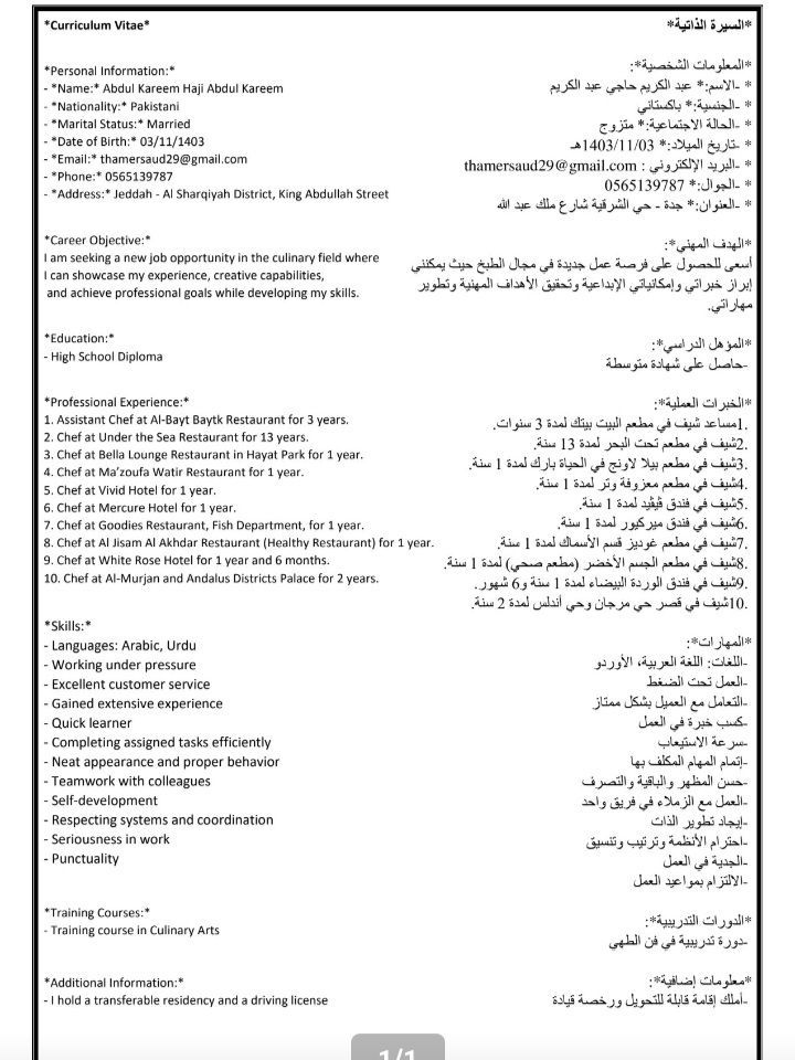 Chef specializing in Eastern and Eastern seafood dishes, with 25 years of experience, is seeking employment in Jeddah. The position offers training in healthy cooking and seafood preparation