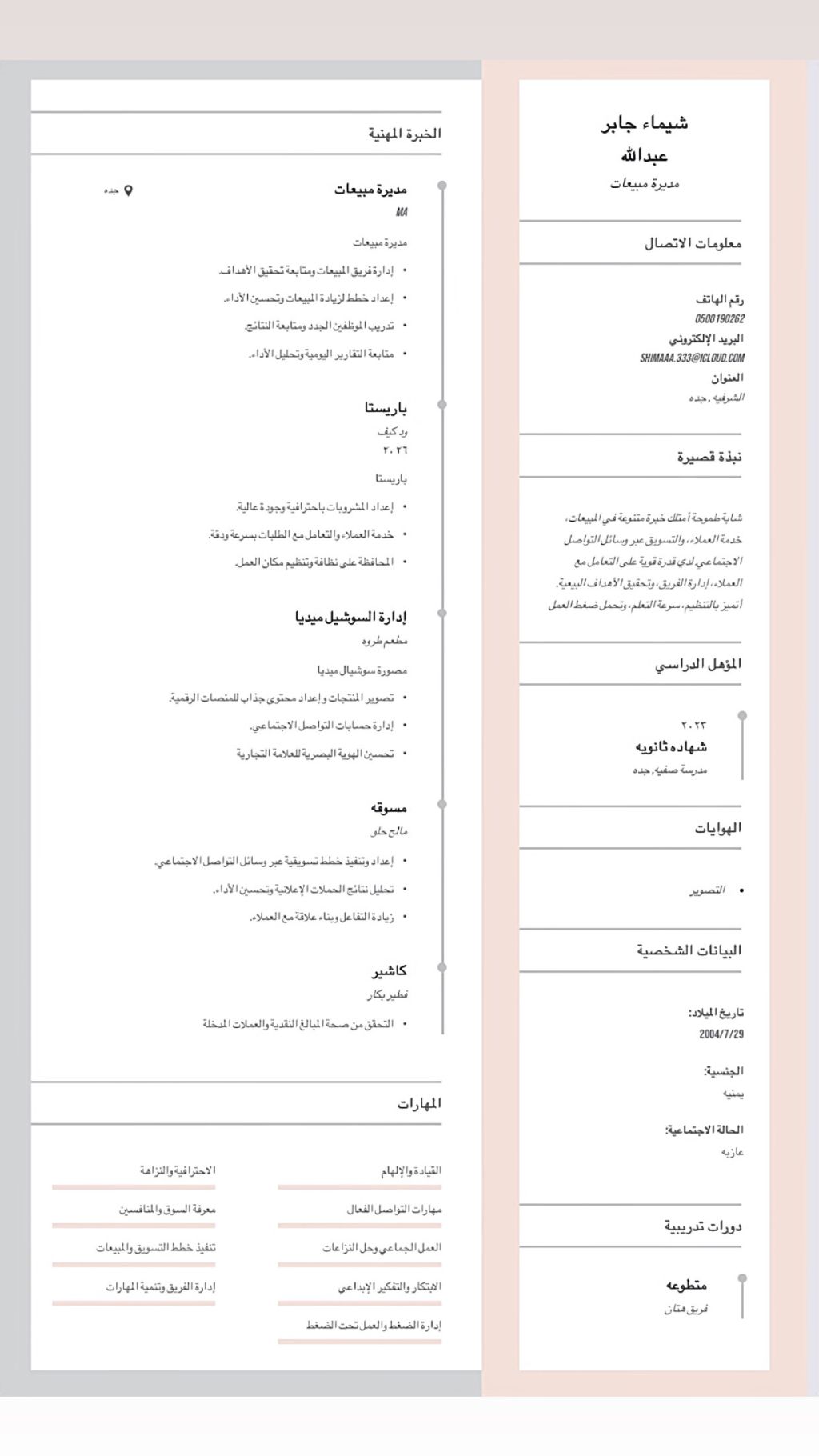 باحثه عن وظيفة في جدة (عندي خبرة كاشير - مطاعم - كافيهات) عندي خبرة باريستا) واشتغلت كول سنتر) واشتغلت وايتر) بنت ومتواجده في جدة