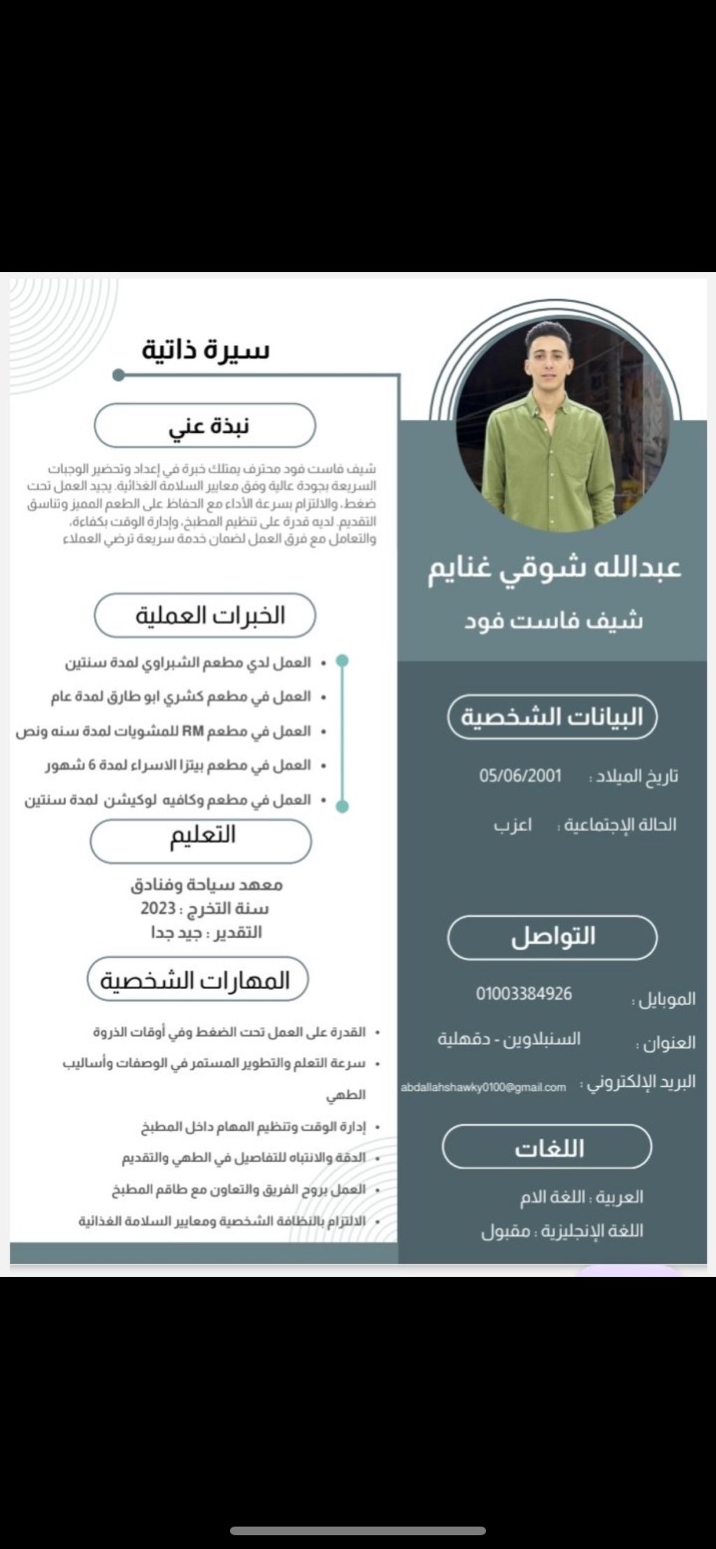 شيف فاست فود خبرة تسع سنوات في المطاعم المصرية