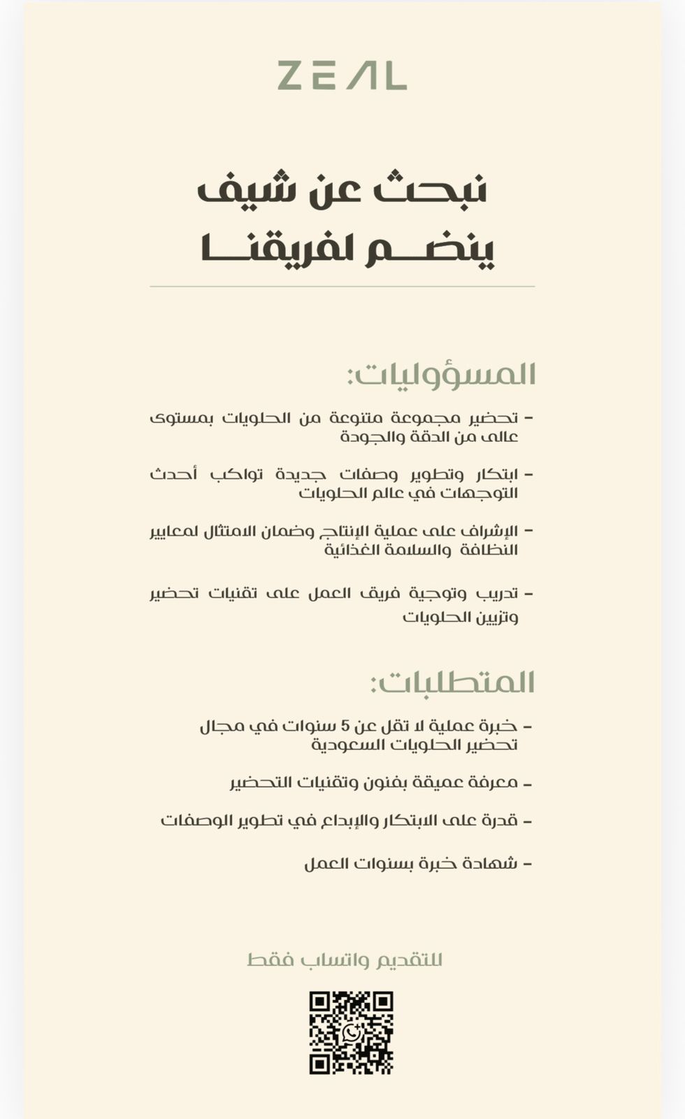 اعلان البحث عن شيف الخبرة 5 سنوات الشرط متواجد في السعودية العمل في مدينة ينبع حي المروج