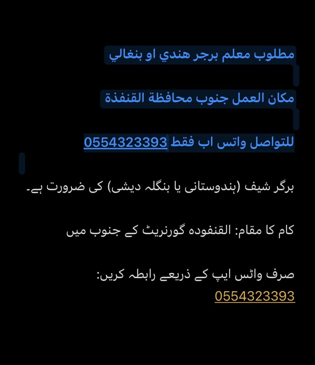 مطلوب معلم برجر هندي أو بنغالي في محافظة القنفذة مركز حلي