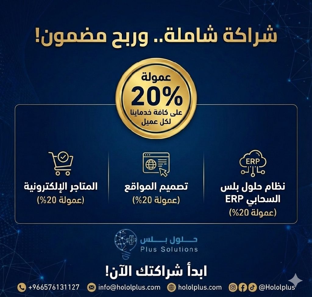 نحن مؤسسة حلول بلس ونقدم خدمات المتاجر الالكترونية، تصميم المواقع، ونظام حلول بلس السحابي ERP. نبحث عن شركاء مبيعات داخل السعودية بعمولة 20% عن كل عميل. مثال واضح عقد بقيمة 3000 ريال عمولتك 600 ريال مباشرة. البيع لعملائك الحاليين فقط، بدون التزامات أو تكاليف. اذا عندك عملاء مهتمين بالخدمات الرقمية أو أنظمة ERP نبدأ فورا