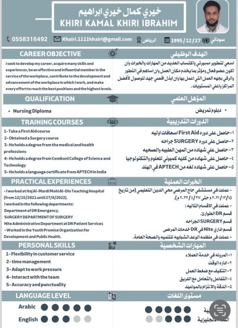 المؤهل الدراسي D تمريض الخبرات العملية عملت في أقسام عدة في قسم الجراحة قسم الطب الباطني وحاصل على دورات داخل المجال وخارج المجال اسعافات أولية جراحه الجراحة الالكترونية