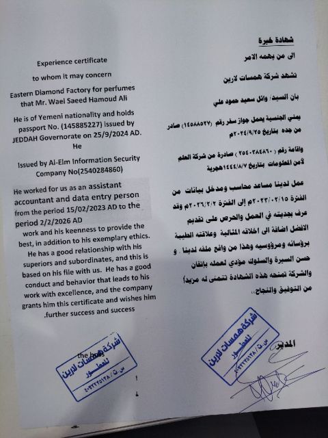 مساعد محاسب ومدخل بيانات بالنظام المحاسبي أونكس برو وبالنظام المحاسبي ايليت سوفت، متميز بالسرعة في ادخال البيانات، خبرة كبيرة في مطابقة أرصدة العملاء والموردين، عمل التقارير اليومية الأسبوعيه والشهرية، عمل قيود رواتب، مطابقة الصناديق، سندات قبض وصرف خبرة كبيرة في الجرد الدوري والسنوي، يبحث عن عمل، يمني مقيم