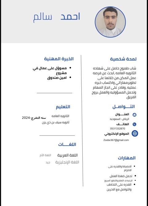 محتاج شغل موجود حاليا في الرياض. أقامه سارية ورخصة سارية الجنسية مصري. خبرات كاشير في الحمراء مول. كاشير النخيل مول. موظف أستقبل في مطعم فيلا فيروز في البجيري الدرعية لدي خبرة جيده في القيادة. أجيد اللغة العربية ألام جيد في اللغة الانجليزية