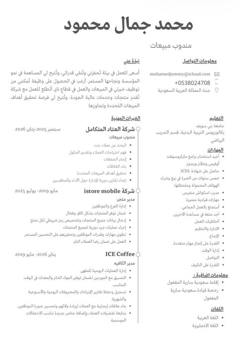 أنا محمد من مصر مقيم في جدة. ابحث عن فرصة عمل مندوب مبيعات أو بائع أو خدمة عملاء أجيد استخدام برامج مايكروسوفت ولدي اقامة سارية ورخصة سارية