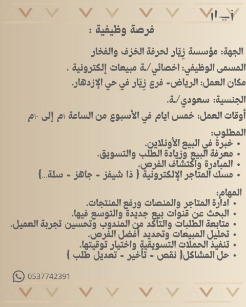 أخصائي/ ة مبيعات الكترونية. الجهة مؤسسة زيار لحرفة الخزف والفخار الجنسية سعودي / ة مكان العمل الرياض - فرع زيار في حي الازدهار. أوقات العمل خمس أيام في الأسبوع من الساعة 1م الى 10م المطلوب خبرة في البيع الاونلاين. معرفة البيع وزيادة الطلب والتسويق. المبادرة واكتشاف الفرص. مسك المتاجر الالكترونية