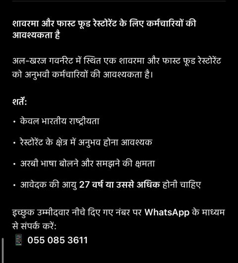 مطلوب موظفين لمطعم شاورما ووجبات سريعة في محافظة الخرج حي السحاب شارع الإمام أحمد بن حنبل بحاجة الى موظفين ذوي خبرة. الشروط 1 - الجنسية الهندية فقط - 2 - وجود خبرة في مجال المطاعم 3 - القدرة على التحدث وفهم اللغة العربية 4 - أن يكون عمر المتقدم 27 سنة فما فوق لمن لديه الرغبة، يرجى التواصل عبر الواتساب على الرقم