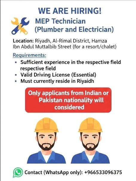 WE ARE HIRING MEP Technician (Plumber and Electrician) Location Riyadh, Al - Rimal District, Hamza Ibn Abdul Muttalib Street (for a resort/ chalet) Requirements Sufficient experience in the respective field Valid Driving License (Essential) Must currently reside in Riyadh Only applicants from Indian or Pakistani nationality will be considered. Contact (WhatsApp only)
