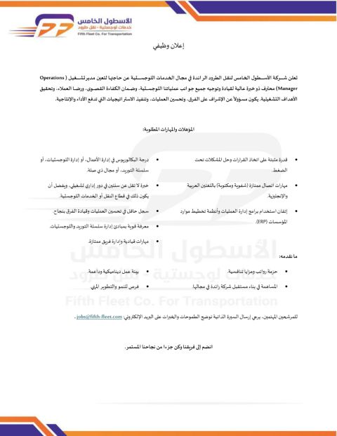 Job Announcement Fifth Fleet Parcel Transport, a leading logistics company, is seeking a highly experienced Operations Manager to lead and direct all aspects of our logistics operations, ensuring maximum efficiency, customer satisfaction, and the achievement of operational objectives. The Manager will be responsible for supervising teams, improving processes, and implementing strategies that drive