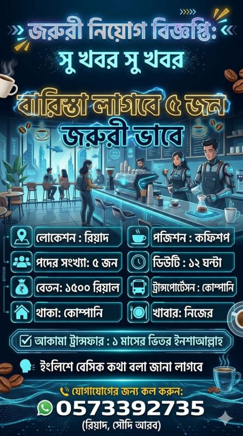 We are hiring Barista Entry level or new trained barista acceptable. Must have good communication skill. Basic salary 1800 Duty hour 12 hour fixed Accomondation & Transportation provided by company Riyadh sulaymaniyah. Transfer sponsorship available. Services charge applied. Nationality Bangladeshi