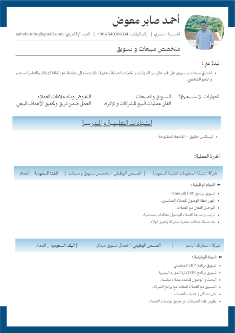 Ahmed Saber, Sales and Marketing Specialist with a high level of skills and practical experience, with more than 8 years of expertise. I also have experience in Saudi Arabia working for a ERP Software company as sales representative. I am seeking a suitable opportunity in Dammam, I have a valid, transferable Iqama and a Saudi private driving license
