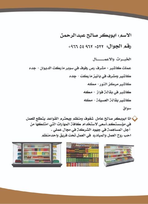 معلم بقالات يبحث عن عمل خبرة 5 سنوات كاشير، صالة، استقبال مناديب. تشيك، رص رفوف، تعامل مع الزبائن بسلاسة، كل ما يخص البقالات يوجد شهادة صحيه