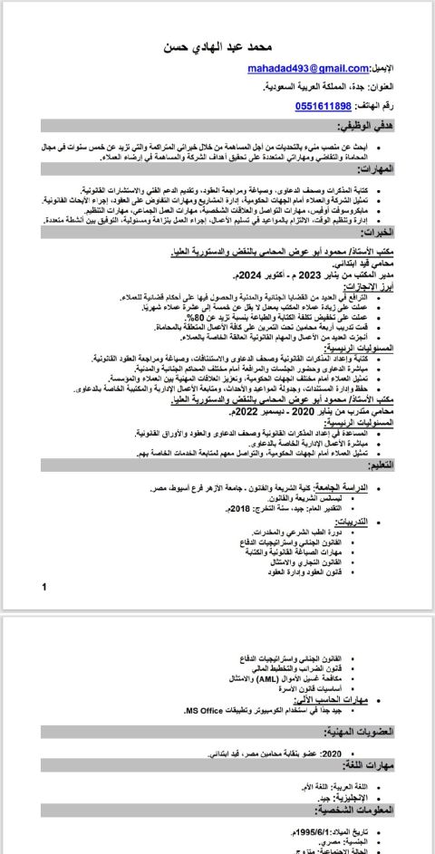 سكرتير تنفيذي بخبرة قانونية الجنسية مصري بخبرة 8 سنوات في مكاتب المحاماة في الكويت. مختص في الصياغة القانونية، اعداد المذكرات والدعاوى، وكتابة العقود. خبرة بالمنصات العدلية السعودية وإدارة المواعيد والأرشفة. اجادة Microsoft Office. مقيم في المدينة المنورة وجاهز للعمل ونقل الكفالة فورا. للتواصل