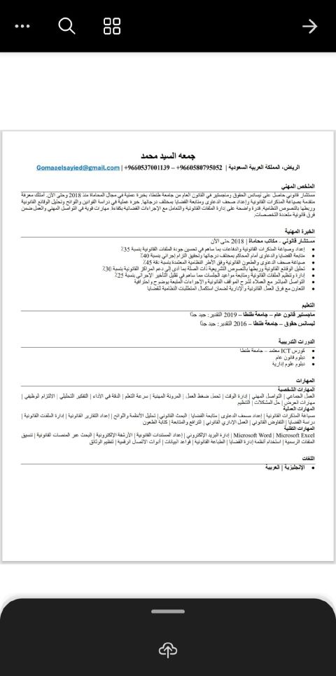 مستشار قانوني عملت لدى مكتب سعودي لدي خبرة في الأنظمة السعودية بالمملكة اعمل علي منصة ناجز اعمل على كتابة العقود - خطابات واعمل على منصات الثوثيق - ومنصات متنوعه مثل نافذ لاصدار سند - الافراغات) التصرفات العقارية (لتحصيل رقم ضريبي. السجل العقاري (لنقل الملكية) البورصة العقاريه (لتحديث الصكوك) وغيرها - التعامل مع الكمبيوتر بشكل جيد وبرامجه المختلفه مثل الوورد والاكسل وسرعة الكتابة على الكيبورد