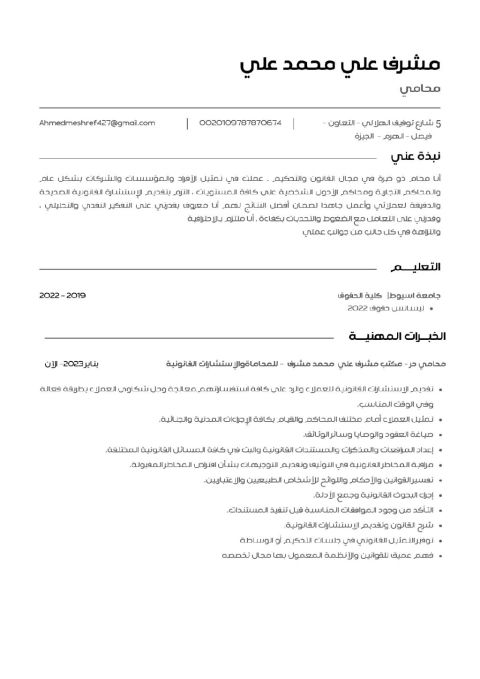 ليسانس الشريعة والقانون - جامعة الأزهر - دفعة 2020. التقدير العام جيد جدا. الدراسات العليا ماجستير بنظام ألد بالومتين المعتمد تين - كلية الحقوق، جامعة المنصورة دبلوم القانون العام - بتقدير ممتاز. دبلوم العلوم الادارية - بتقدير جيد جدا. العمل في العديد من القضايا الجنائية والمدنية وقضايا الأحوال الشخصية. اعداد صحف الدعاوى والمذكرات القانونية تقديم الاستشارات القانونية ومتابعة اجراءات التقاضي