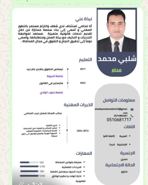 مستشار قانوني مصري حاصل على ليسانس الشريعة والقانون جامعة الأزهر في القاهرة عام 2006 بتقدير جيد جدا وماجستير القانون العام عام 2008 على خبرة كبيرة بالعمل القانوني بالمملكة من دراسة العقود وكتابتها بجميع أنواعها وكذا دراسة القضايا وابداء الرأي فيها وكتابة المذكرات القانونية بجميع أنواعها وعملت مستشارا قانونيا لدى الكثير من مكاتب المحاماة وشركات المقاولات بالمملكة أرغب في الالتحاق بعمل مناسب
