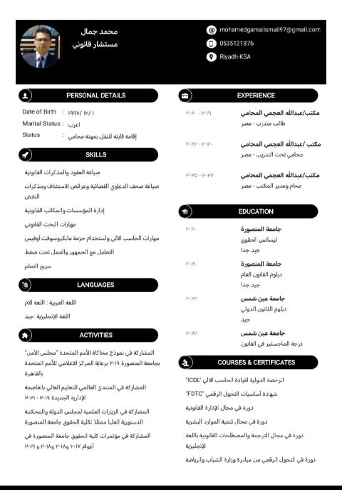 محامي مصري خريج كلية حقوق جامعة القاهرة بتقدير عام جيد خبرة ثلاث سنوات في مجال المحاماة متواجد في المملكة العربية السعودية