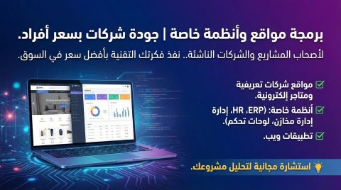 بدلا من دفع مبالغ طائلة لشركات البرمجة والتسويق. أعرض عليك خدماتي كمطور ويب (مستقل) لتنفيذ فكرتك التقنية بنفس جودة الشركات الكبيرة ولكن بتكلفة الأفراد. 1 أنظمة إدارة برامج (ERP) شؤون موظفين (HR) ولوحات تحكم خاصة. 2 تصميم المتاجر الكترونية والمواقع التعريفية للشركات. 3 برمجة خاصة حلول ويب متكاملة (Full Stack) استشارة مجانية لتحليل مشروعك