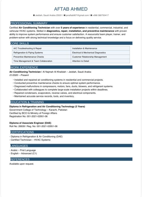 أنا فني تكييف، لدي خبرة تزيد عن 8 سنوات في هذا المجال. حاصل على شهادة دبلوم لمدة 3 سنوات. تركيب وصيانة واستكشاف الأخطاء وإصلاحها، الخ. أنا في جدة، البوادي. تواصل معي