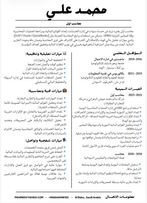 أنا شاب مصري طموح ابحث عن فرصة عمل تناسب خبرتي في المحاسبة المالية وإدارة التكاليف تحليل البيانات لتحسين الربحية ومراقبة التدفقات وإدارة المخزون وتنظيم الجرد وموظف موارد بشرية والخدمات العامة في كل ما يخص مسير الرواتب وانشاء عقود العمل الخ. أتميز بالدقة والالتزام بالمواعيد وقدرة على العمل الجماعي مع حرصي على تطوير مهاراتي باستمرار أطمح بيئة عمل حضارية تسعي للتطوير النمو
