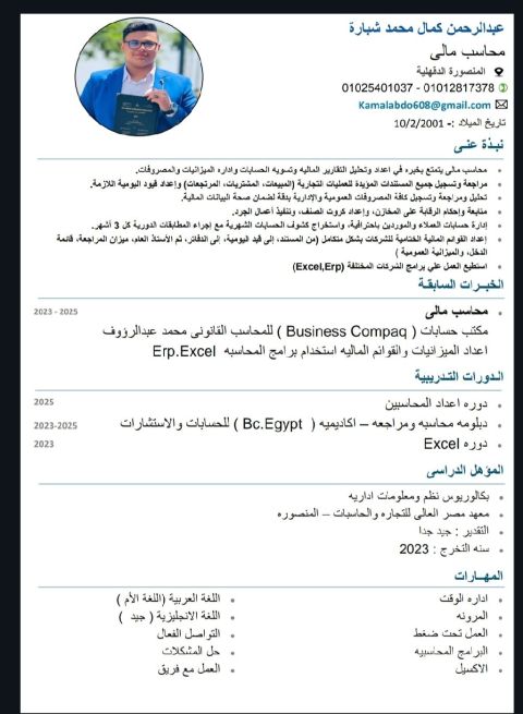محاسب مصري ابحث عن عمل خبرة أكثر من ثلاث سنوات في مجال وشركات المقاولات ومكاتب المحاسبه والمراجعة أتمتع بمهارات قوية في إدارة الحسابات وتحليل البيانات المالية لضمان تحقيق الكفاءة المالية قادر علي العمل علي البرامج المحاسبية (ERB System) دفتره - قيود) قادر علي استخدام برامج مايكروسوفت أوفيس (Excel - word - PowerPoint) قادر علي استخدام منصة مدد ورفع مسيرات الروات