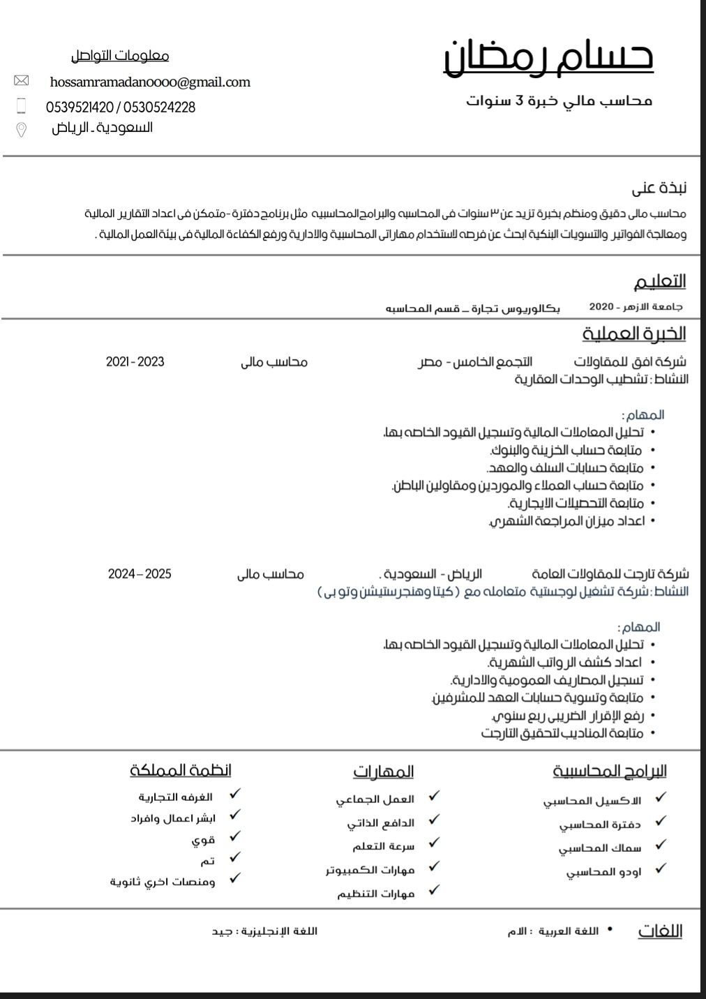 محاسب عام مصري خبرة 3 سنوات عمل بكبرى شركات الوجستك والشركات التجاربه له خبرة في البرامج المحاسبية مثل قيود ودفترة وأونكس كما يجيد التعامل مع الأوفيس واعداد التقارير اليوميه والشهريه وتقفيل الكاشير واليوميات للنشاط وأيضا يجيد التعامل مع المنصات الحكوميه واعداد القوائم الماليه ورفع الاقرارات الضريبيه إقامة سارية متاح النقل وتس