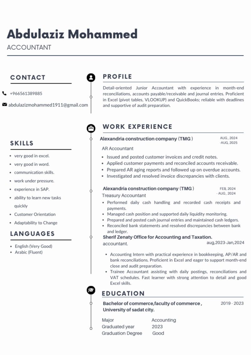 محاسب خبرة سنتين في مجموعة طلعت مصطفى خبرة في SAP erp مقيم في جدة وابحث عن عمل